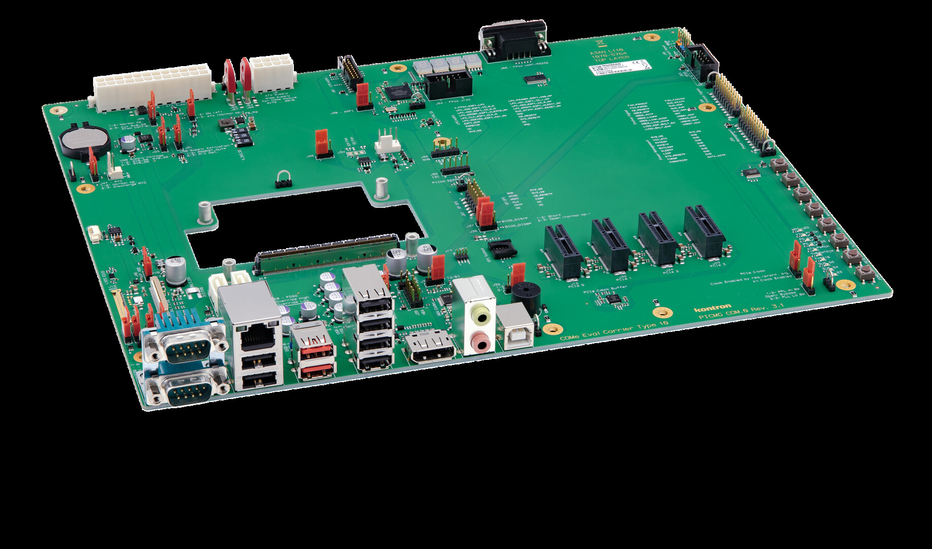 The COM Express® Evaluation Carrier Type 10 is designed for COM Express® mini COMs, offering interfaces for PCI Express, Gigabit Ethernet, SATA, USB 3.2 Gen1/USB 2.0, LVDS (eDP optionally), DisplayPort and more. With a complete array of connectors brought out on this carrier board, it serves as a reference design for other more customized variations.