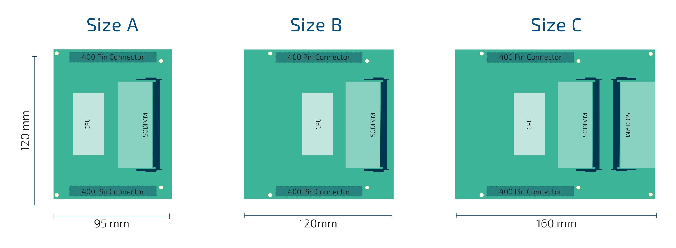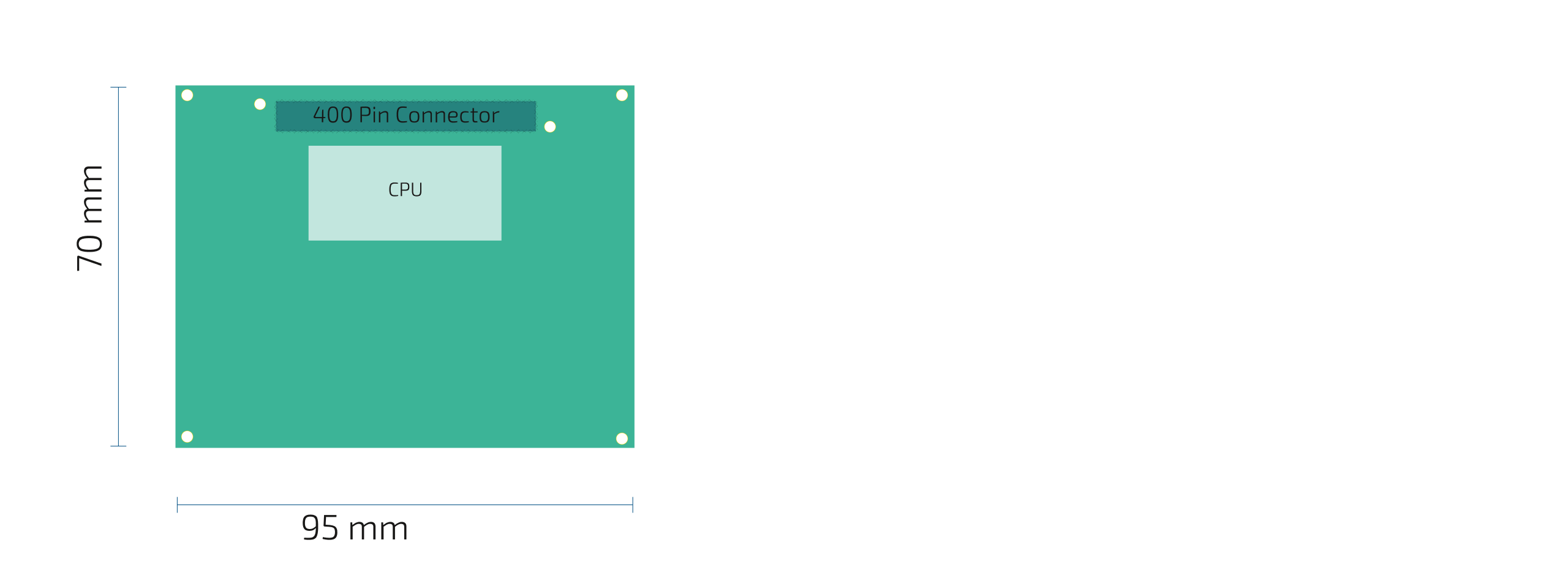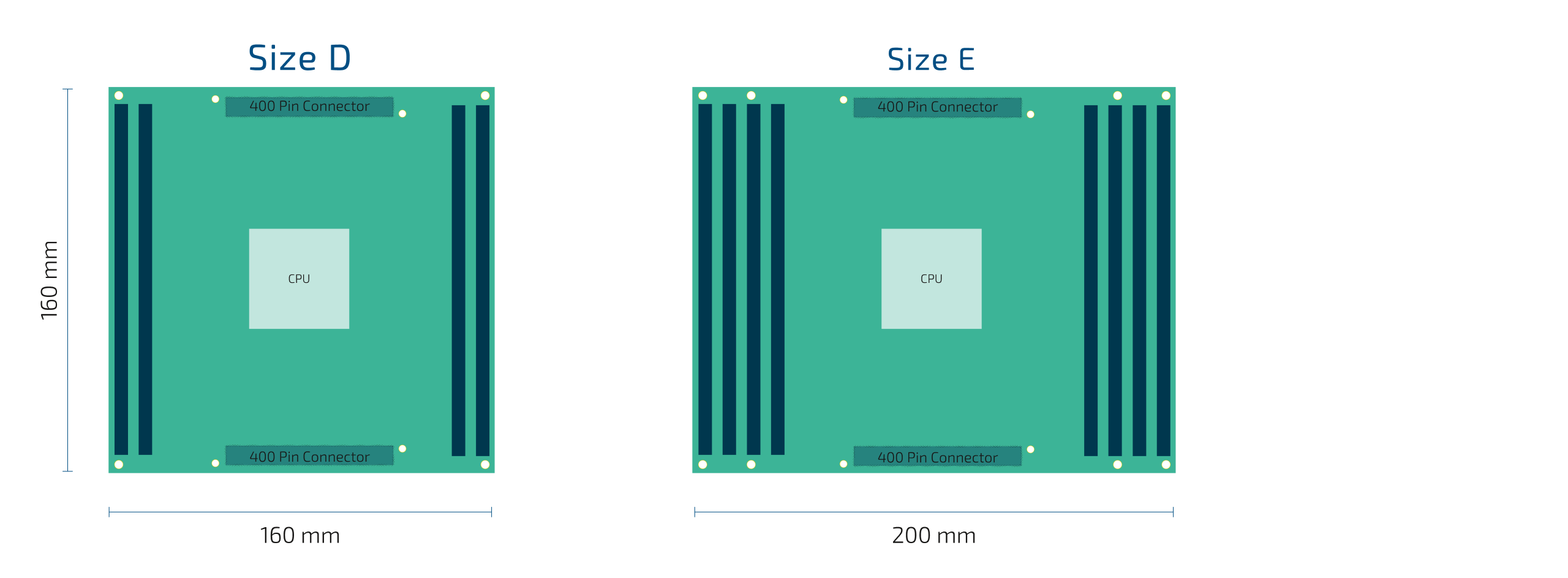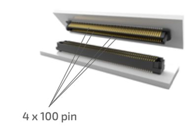 In order to support the future oriented pin-out definition a new connector has been introduced with 400 pins. The COM-HPC® standard defines 5mm and 10mm stack height for the carrier connector. The Mini size uses a single connector; all other sizes use two connectors for a total of 800 pins addressing the increasing performance demands and bandwidth needs.