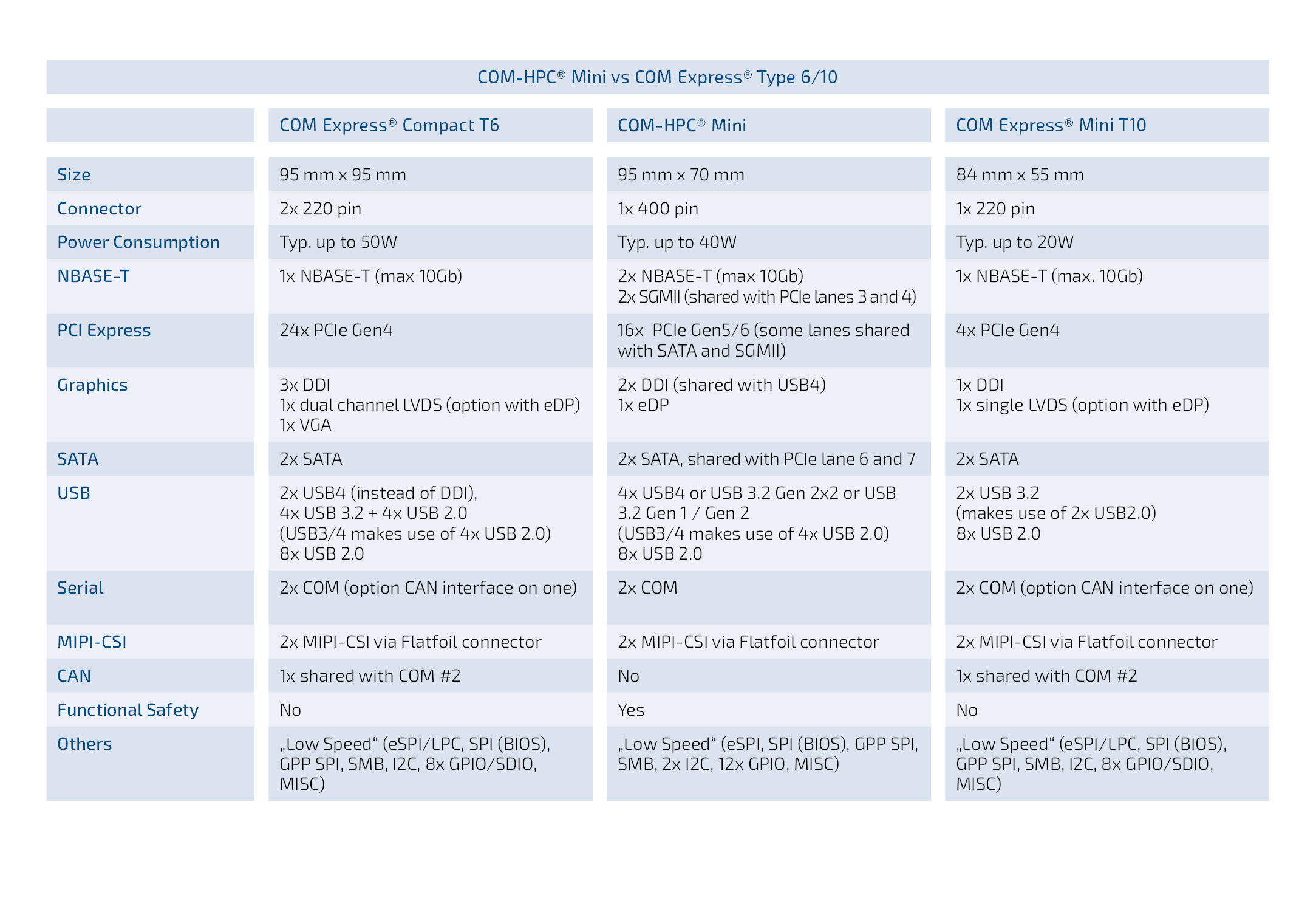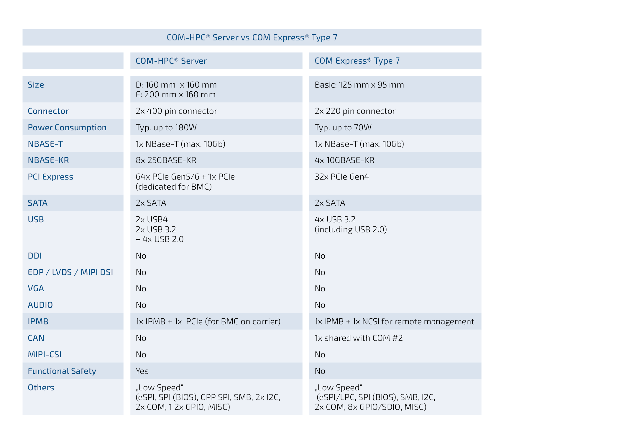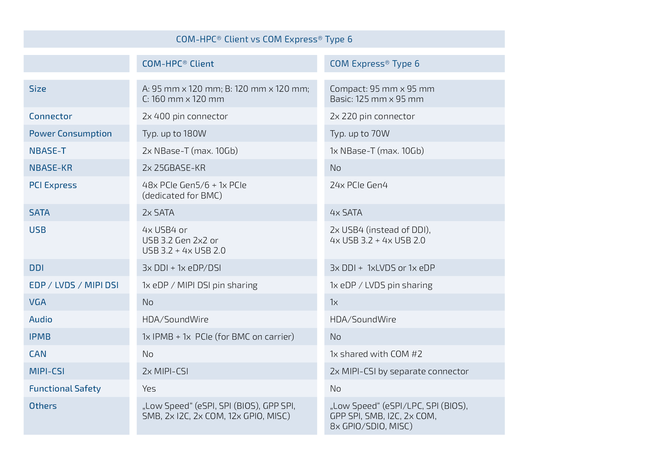 COM Express®, the successful and worldwide leading standard for Computer-on-Modules since 2005, will continue to provide a reliable and long-lasting service for traditional embedded industrial computing demands. Here we give an overview and comparison of the technical details between COM-HPC® and COM Express® for your orientation: